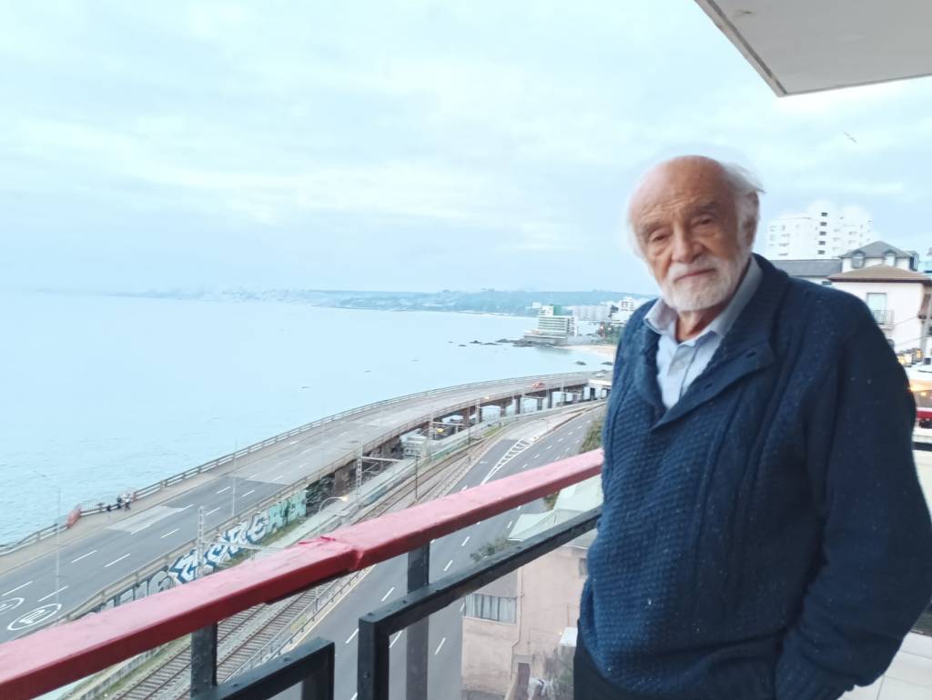 Vive justo frente el mar casi en la frontera entre Viña del Mar y Valparaíso, desde allí, supervisa con la mirada, las mareas, las migraciones de las aves y la inexorable decadencia de la ciudad puerto.
