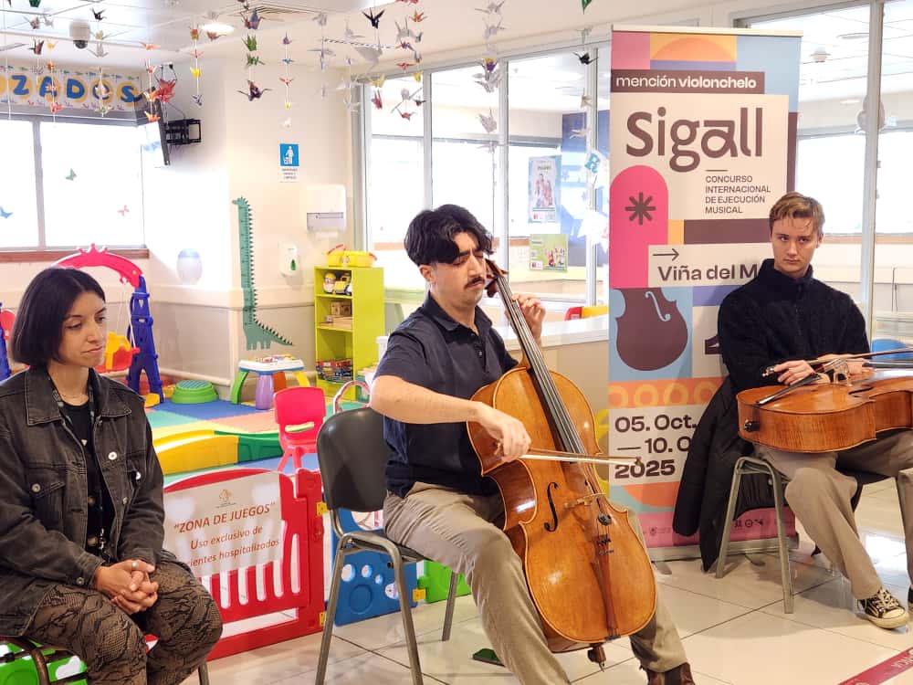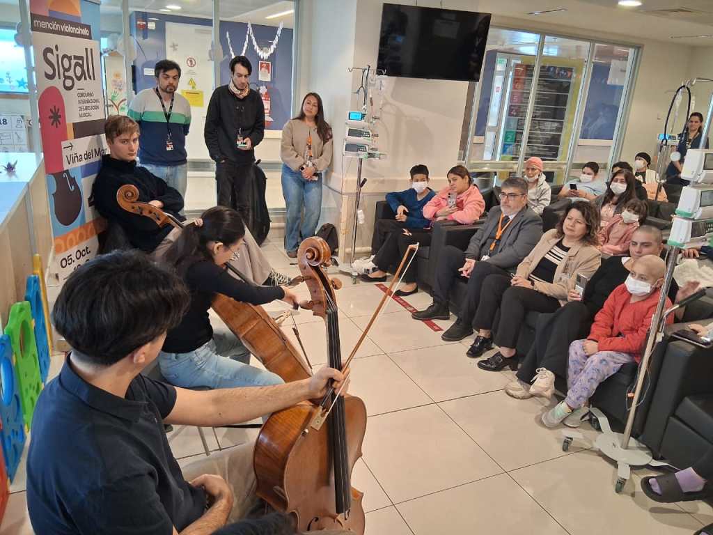 - Tres jóvenes intérpretes de violoncelo deleitaron a funcionarios, pacientes y familiares para promover el certamen internacional viñamarino.
